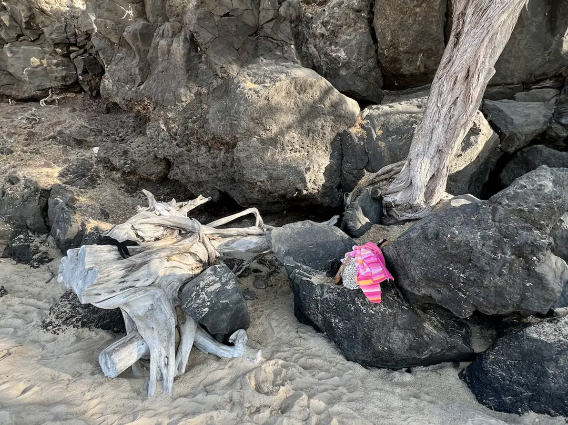 My beach bag on a volcanic rock at the south end of Hapuna Beach.